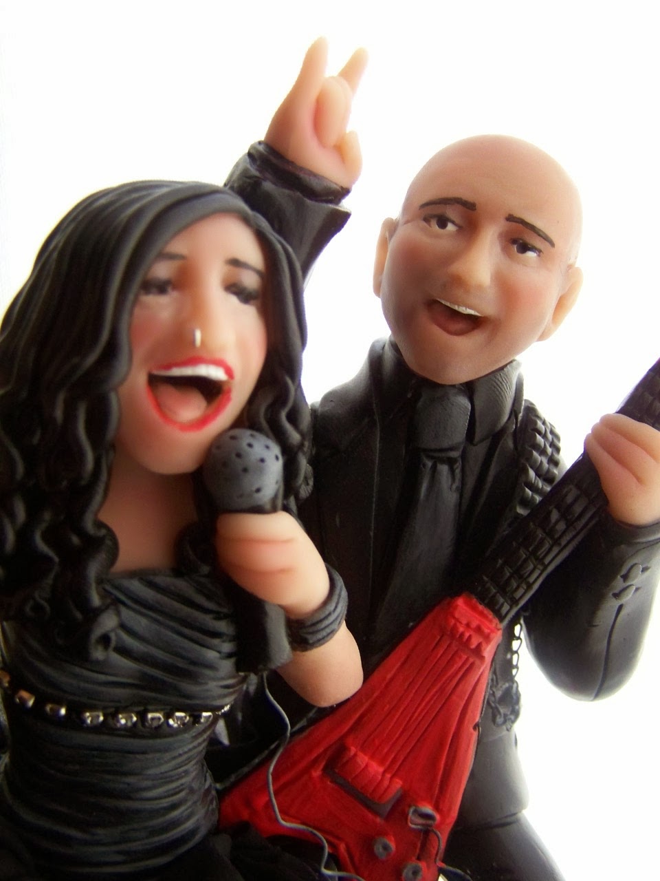 Para Novios muy Rockeros una Tarta Falsa de 2 pisos en Papel Mache con las Figuras personalizadas montadas en ella...